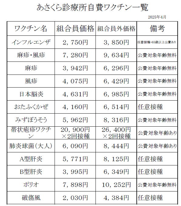 あさくら診療所ワクチン料金表(消費税込み) 2025年4月